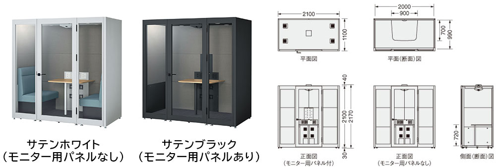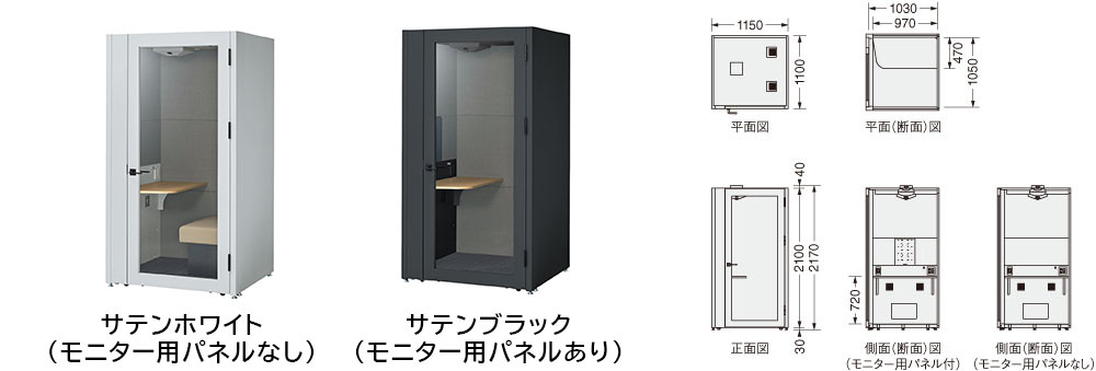 ●本体:スチール・粉体塗装、キャスター・アジャスター付 ●背面パネル:スチール・粉体塗装 ●内装パネル:〔張材〕不燃クロス・〔芯材〕グラスウール ●天板:木製・メラミン化粧板・20mm厚 ●LEDライト、換気ファン、USB-C・AC電源コンセント、ソファー付 ●天井:熱感知式自動消火装置付 ●AT-254オールチタンコーティング標準施工 ※【1人用コンパクト】はモニター用パネルの設置はできません。 |